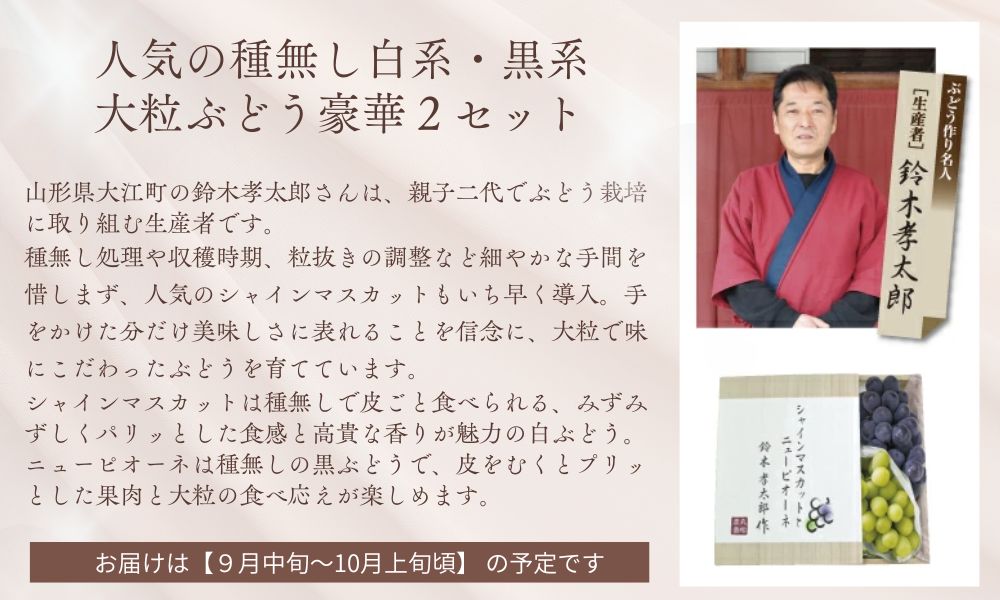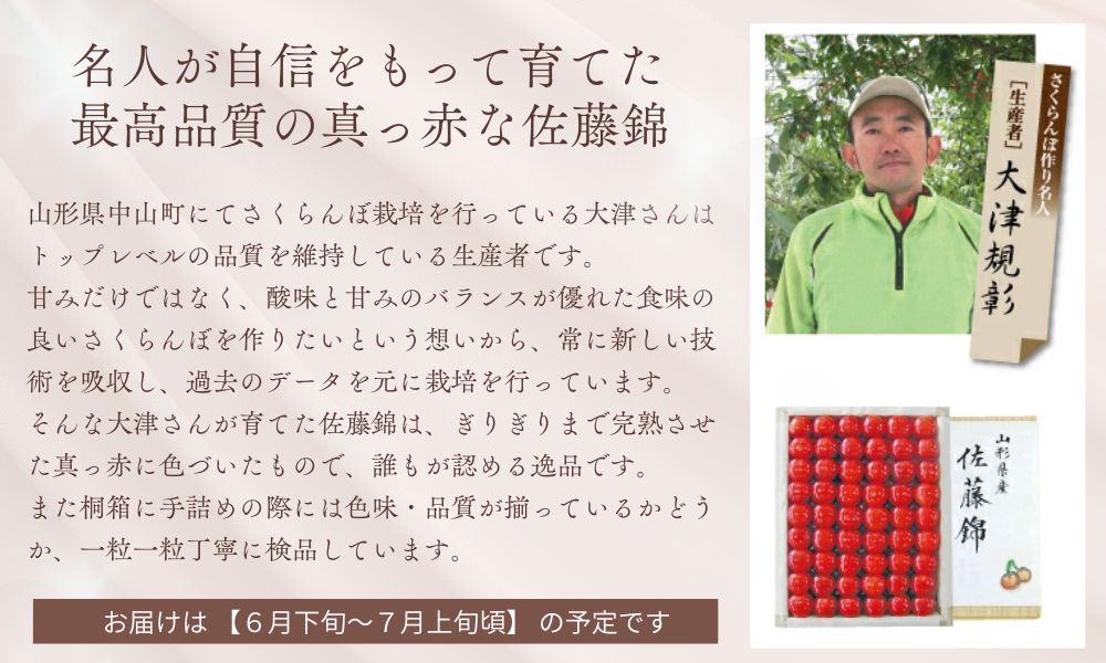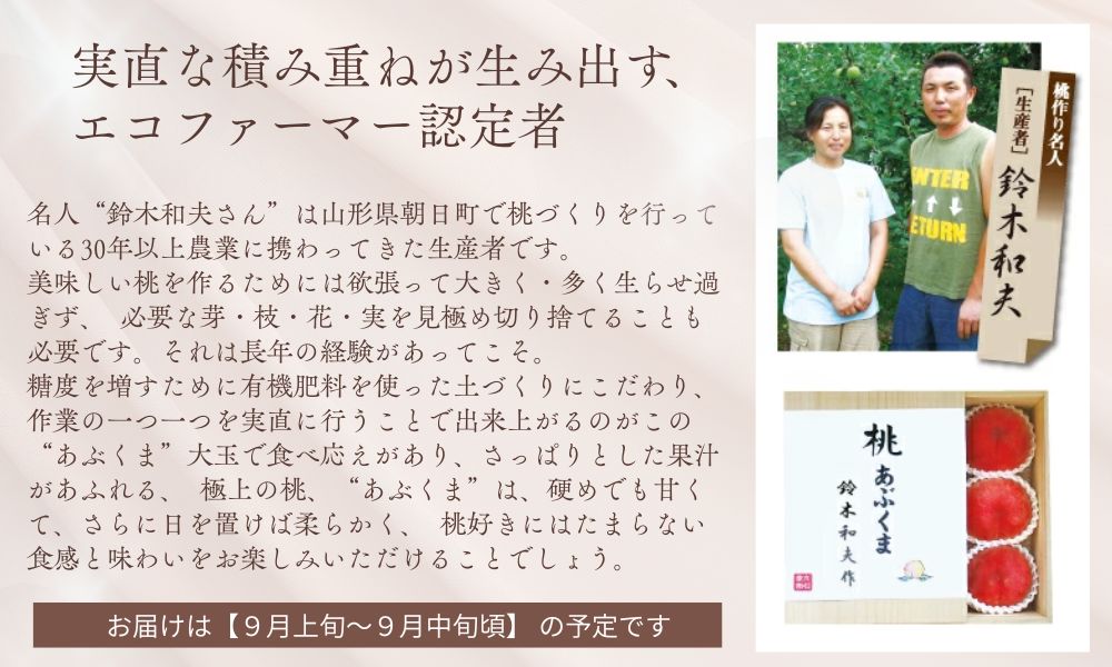 | 発送時期 | 6~10月頃まで計3品、ご注文順での発送 さくらんぼ:6月下旬から7月上旬頃 白桃:9月上旬から9月中旬頃 ぶどう:9月中旬から10月上旬頃 ※お届け日指定不可 ※収穫の状況により、時期が前後することがございます。 |